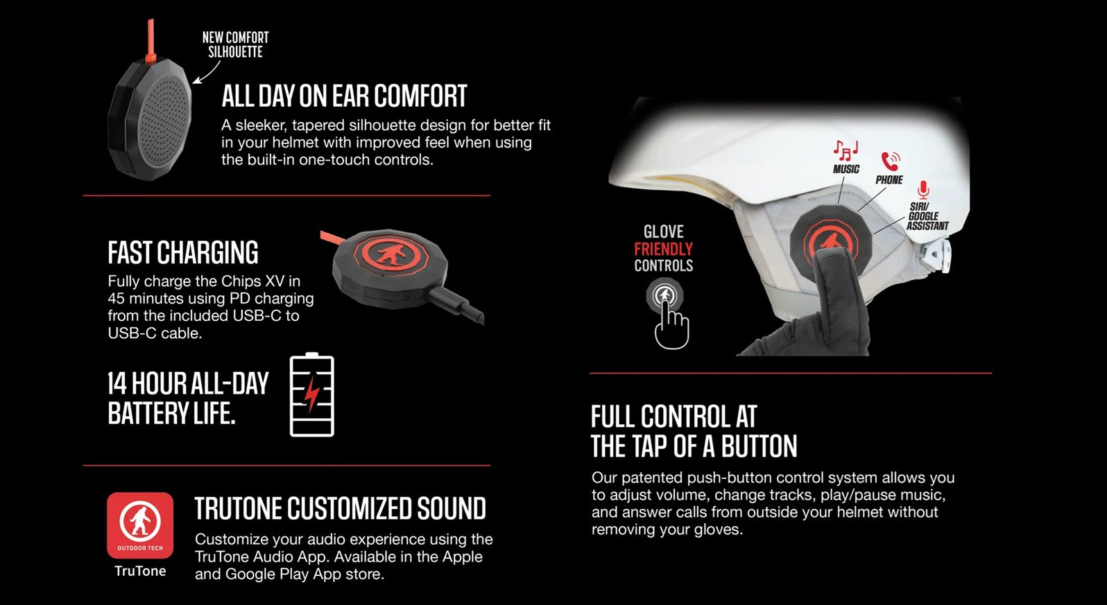 The wireless helmet audio system built for skiers and riders who want great sound without breaking stride. Designed to drop into almost any helmet, the updated Chips XV now deliver a more comfortable fit, longer-lasting performance, and better connection than ever before. With TruTone EQ customization, upgraded Bluetooth 5.3, and quick-charge capability, you’ll be set for everything from park laps to powder days. All with simple glove-friendly controls that just work when you need them most.